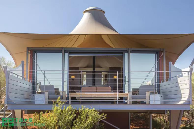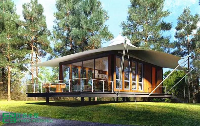 木屋和帐篷的完美结合,外观款式上我们可以根据客户的要求去进行更多的变化,做到在每一款帐篷木屋设计上都能够与周边自然环境相融。